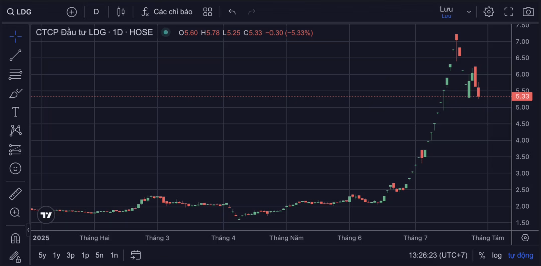 Thị trường chứng khoán Việt Nam vừa kỷ niệm 25 năm thành lập với nhiều dấu ấn đáng nhớ, đỉnh cao là VN-Index đạt mức kỷ lục 1.557,42 điểm cùng thanh khoản lên đến gần 2 tỷ USD. Tuy nhiên, không phải tất cả các công ty đều có diễn biến tích cực trong giai đoạn này. Cổ phiếu LDG của Công ty cổ phần Đầu tư LDG, một doanh nghiệp bất động sản có tiếng, lại có diễn biến đi ngược lại, giảm sàn về 5.630 đồng/đơn vị.