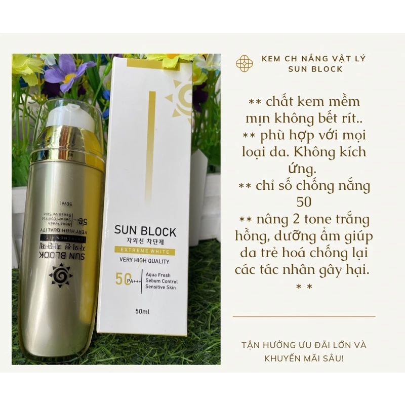Bạn có thể tham khảo sản phẩm kem chống nắng vật lý SUN BLOK 2in1 chính hãng giá rẻ 160k thay 196800d tại đây.