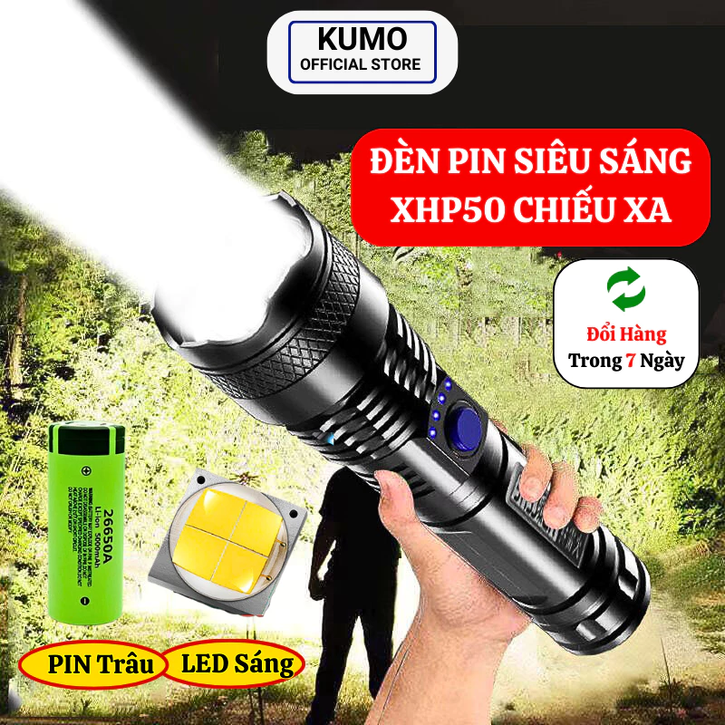 Đèn pin siêu sáng Kumo Chip Cob XHP50 có độ sáng lên đến 1050 lumen và thời gian sử dụng lên đến 12 giờ. Chiếc đèn pin này sử dụng chip XHP50 cao cấp và có khả năng chống nước với chỉ số IP65. Ngoài ra, đèn pin này còn có tích điện với dung lượng 2600mAh, giúp bạn có thể sử dụng trong thời gian dài.